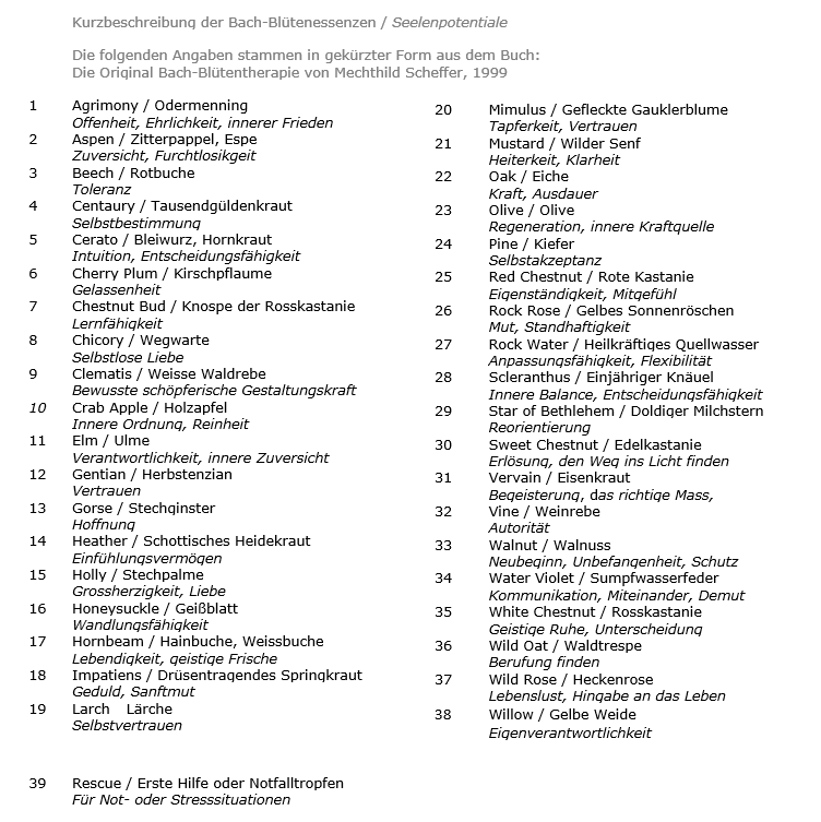 Kurzbeschreibung der Bachblütenessenzen / Seelenpotentiale